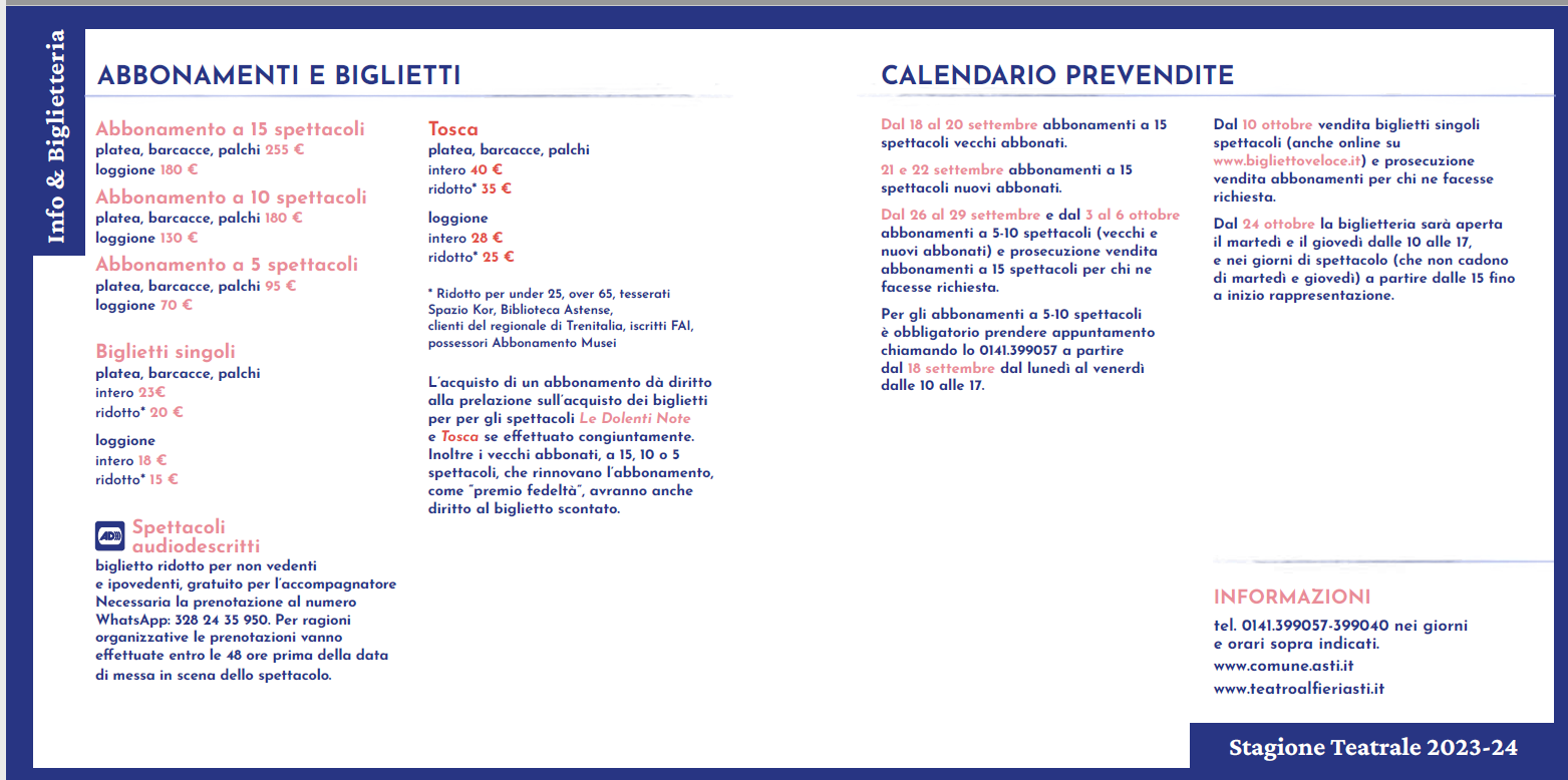 tel. 0141.399057-399040 negli orari di apertura della biglietteria