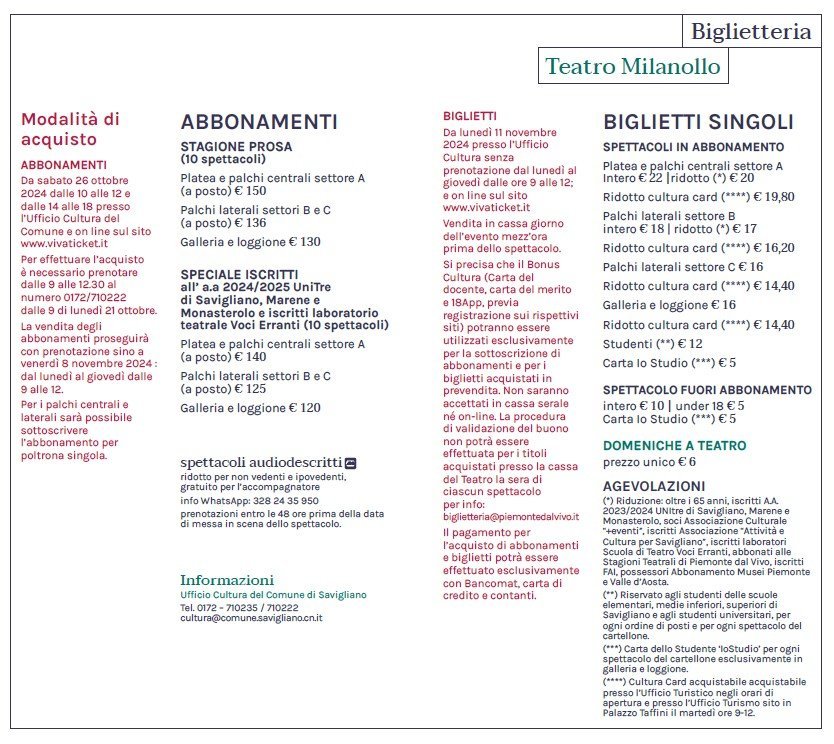 Per ragioni organizzative le prenotazioni vanno effettuate entro le 48 ore prima della data di messa in scena dello spettacolo.