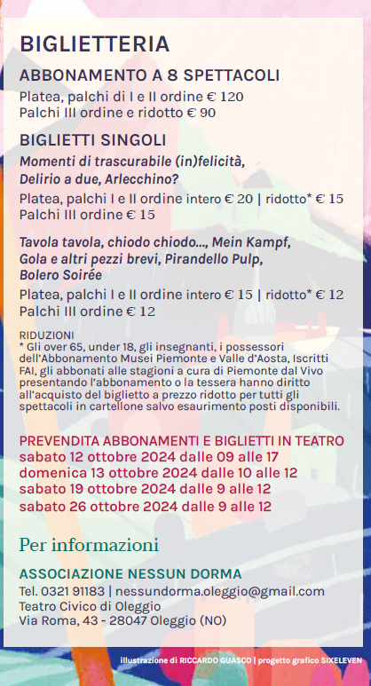Per ragioni organizzative le prenotazioni vanno effettuate entro le 48 ore prima della data di messa in scena dello spettacolo.
